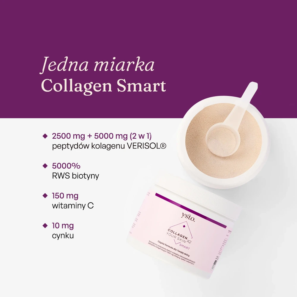 Kolagen w proszku Ysto Collagen Smart to sprytne połączenie dwóch rodzajów niskocząsteczkowych peptydów kolagenowych 7500 mg (aż 2 brandowane kolageny w 1 porcji), 5000% RWS biotyny, cynku i witaminy C dla pięknej skóry i włosów.