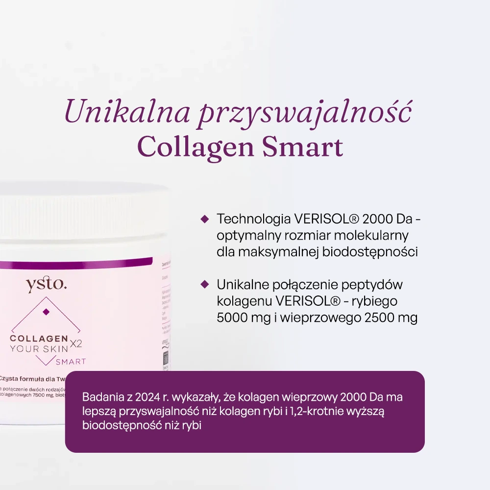 Najlepszym określenie suplementu jest kolagen rybno-wieprzowy. Collagen Smart zawiera dwa rodzaje peptydów kolagenowych VERISOL®. Rybie peptydy kolagenu pochodzą z ryb morskich i jest ich 5000 mg. Jest to ilość zgodna z badaniami dla tego konkretnego kolagenu rybiego. Dodatkowo suplement zawiera 2500 mg kolagenu wieprzowego, który szczyci się badaniami z innego obszaru działania.