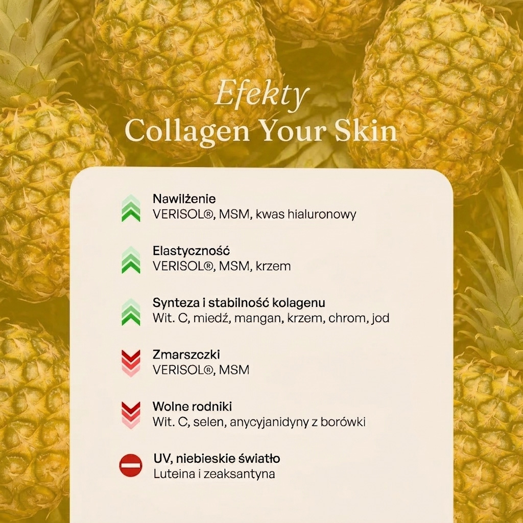 Rybie peptydy kolagenowe Verisol®; wieprzowe peptydy kolagenowe Verisol®; metylosulfonylometan (MSM); regulator kwasowości – kwas cytrynowy; ekstrakt z owoców dzikiej róży (Rosa canina) [70% witaminy C]; aromaty naturalne; sól sodowa kwasu hialuronowego; naturalny aromat grejpfrutowy z innymi naturalnymi aromatami; ekstrakt z pędów bambusa (Bambusa vulgaris) [70% krzemionki]; ekstrakt z owoców borówki czarnej (Vaccinium myrtillus) [25% antocyjanidyn]; L-selenometionina – Selenium SeLECT®; ekstrakt z kwiatów aksamitki wzniesionej (Tagetes erecta) [20% luteiny, 4% zeaksantyny]; glukonian manganu (mangan); substancja słodząca: glikozydy stewiolowe; glukonian miedzi (II) (miedź); pikolinian chromu (chrom); jodek potasu (jod).