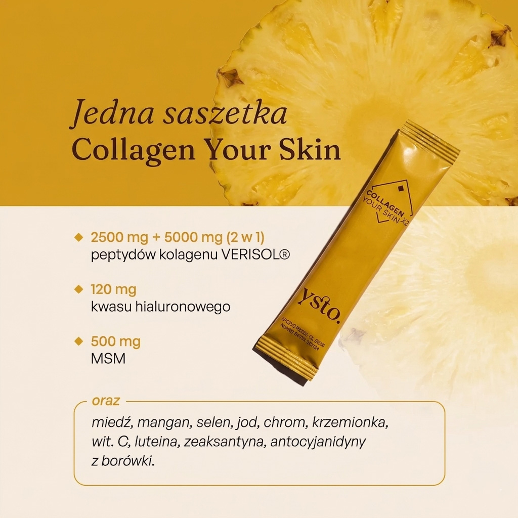 Najlepsze efekty osiągniesz, stosując kurację w cyklu 3+3 Collagen Your Skin (saszetki) i Collagen Smart (kolagen w proszku). Zacznij od 3 miesięcy suplementacji Ysto Collagen Your Skin. Pozwól bogatej kombinacji minerałów, antyoksydantów i peptydów kolagenowych działać. Jeżeli zauważysz widoczne rezultaty, a skóra wysyci się składnikami, po 3 miesiącach zmień suplement na Collagen Smart, aby wykorzystać potencjał biotyny i cynku.
