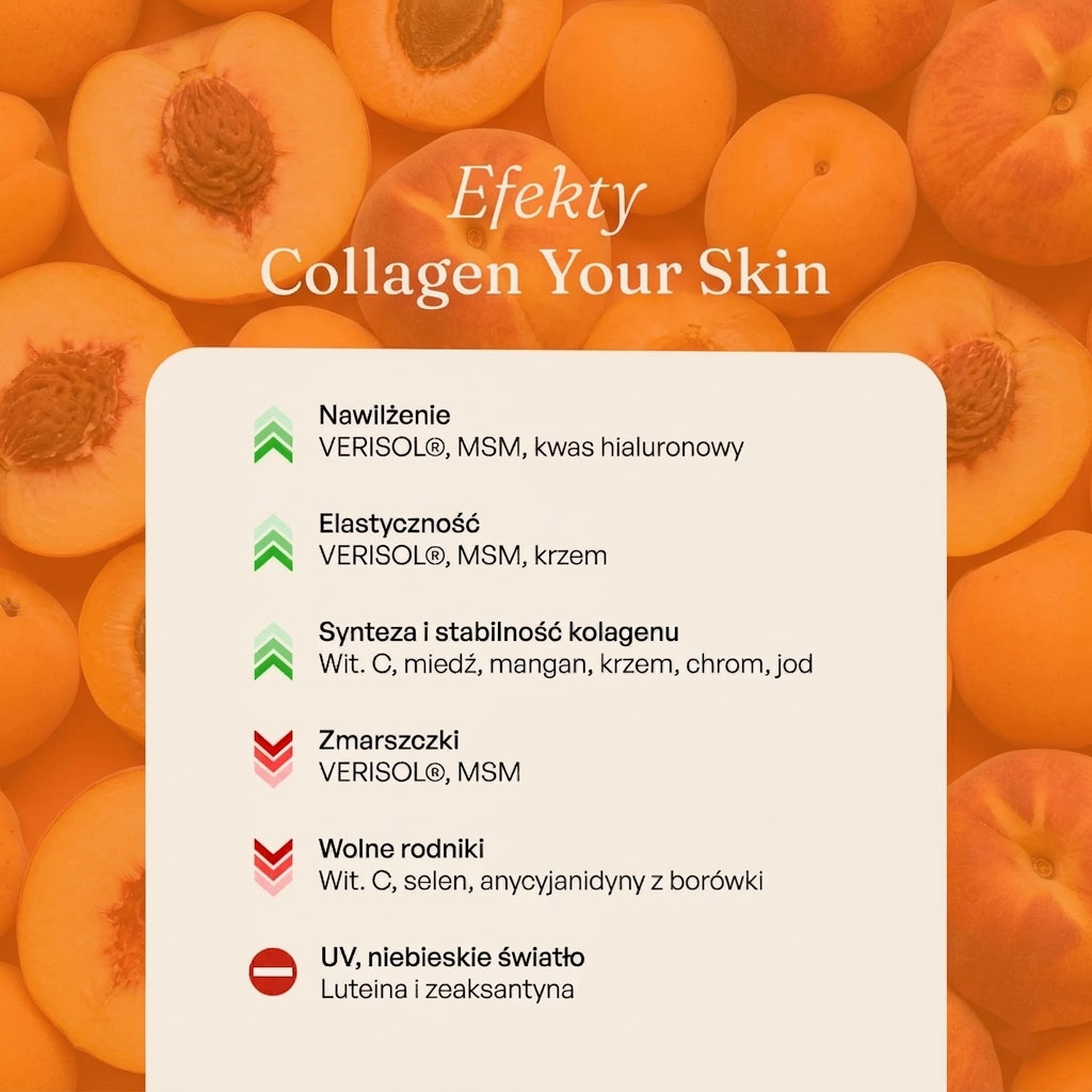 Rybie peptydy kolagenowe Verisol®; wieprzowe peptydy kolagenowe Verisol®; metylosulfonylometan (MSM); regulator kwasowości – kwas cytrynowy; ekstrakt z owoców dzikiej róży (Rosa canina) [70% witaminy C]; aromaty naturalne; sól sodowa kwasu hialuronowego; naturalny aromat pomarańczowy z innymi naturalnymi aromatami; ekstrakt z pędów bambusa (Bambusa vulgaris) [70% krzemionki]; ekstrakt z owoców borówki czarnej (Vaccinium myrtillus) [25% antocyjanidyn]; barwnik – beta-karoten; L-selenometionina – Selenium SeLECT®; ekstrakt z kwiatów aksamitki wzniesionej (Tagetes erecta) [20% luteiny, 4% zeaksantyny]; substancja słodząca: glikozydy stewiolowe; glukonian manganu (mangan); glukonian miedzi (II) (miedź); pikolinian chromu (chrom); jodek potasu (jod).