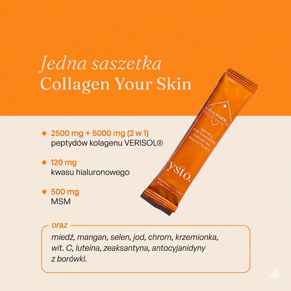 Najlepsze efekty osiągniesz, stosując kurację w cyklu 3+3 Collagen Your Skin (saszetki) i Collagen Smart (kolagen w proszku). Zacznij od 3 miesięcy suplementacji Ysto Collagen Your Skin. Pozwól bogatej kombinacji minerałów, antyoksydantów i peptydów kolagenowych działać. Jeżeli zauważysz widoczne rezultaty, a skóra wysyci się składnikami, po 3 miesiącach zmień suplement na Collagen Smart, aby wykorzystać potencjał biotyny i cynku.