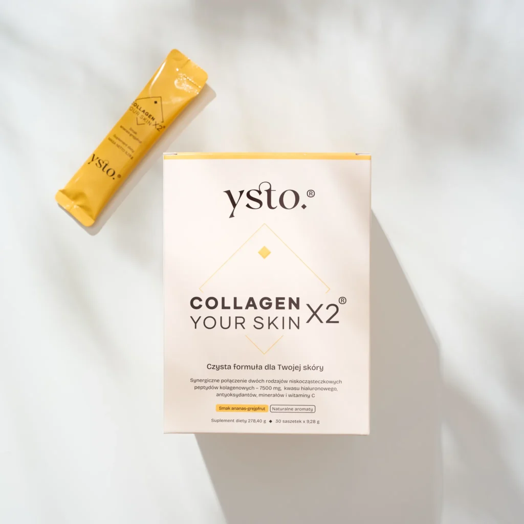 Zaawansowana formuła inspirowana potrzebami skóry i stawów. Kolagen do picia Ysto® Collagen Your Skin to synergiczne połączenie dwóch rodzajów niskocząteczkowych peptydów kolagenowych 7500 mg (kolagen rybi i kolagen wieprzowy) o masie cząsteczkowej 600-2000 Da, 120 mg kwasu hialuronowego, antyoksydantów, minerałów i witaminy C.